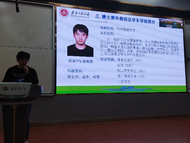 大四毕业班优秀考研学生程子龙(拟录取到中国科学技术大学)、陈树楷(拟录取到华中科学技术大学)、刘甜甜(拟录取到华东理工大学)三位同学做了精彩深刻的发言。三位同学一致认为,大学生从一开始就要明确目标,通过不断努力和实践,一定会在大四毕业之际获得大丰收,不给大学生涯留下遗憾。