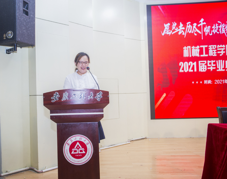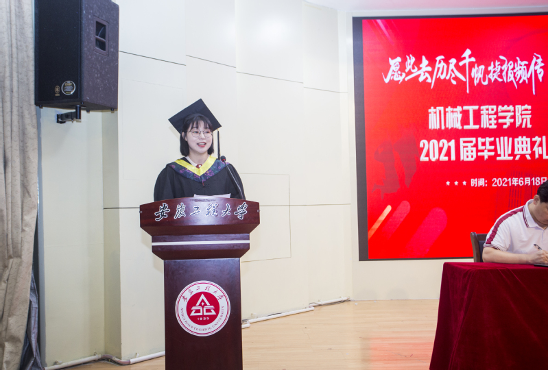 仪式中,学院党委副书记何志恒宣读了《安徽省普通高等学校优秀毕业生》名单和《安徽工程大学2021届优秀毕业生》名单,教师代表裴九芳、毕业生代表李晨静、在校生代表杨怡欣上台发言。许德章为毕业生扶正流苏并合影留念。