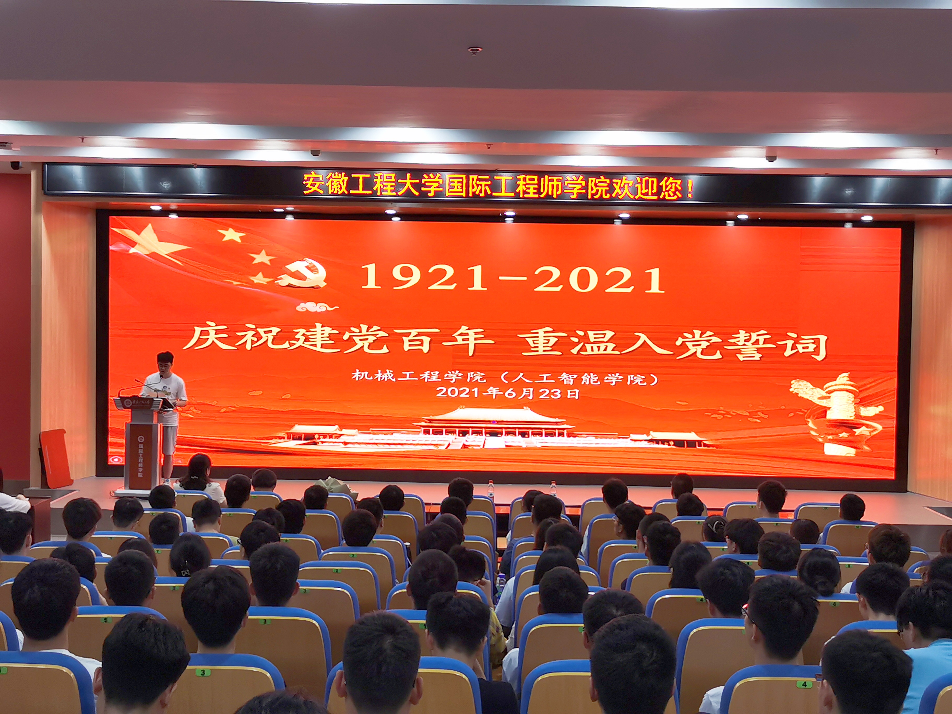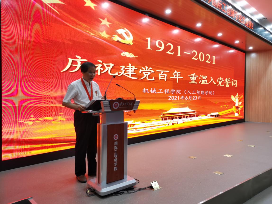 为庆祝中国共产党成立100周年,深入推进党史学习教育,6月23日下午,机械工程学院(人工智能学院)在国际工程师学院大报告厅举行“庆祝建党百年,重温入党誓词”主题党日活动。学院党委副书记李文江、教师党员代表、2018和2019级全体学生党员以及研究生支部党员代表参加党日活动,活动特别邀请离退休党委苏自林老师参加。活动由学生支部书记王海燕主持。