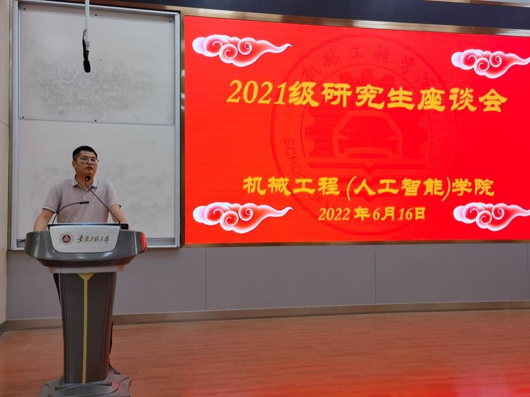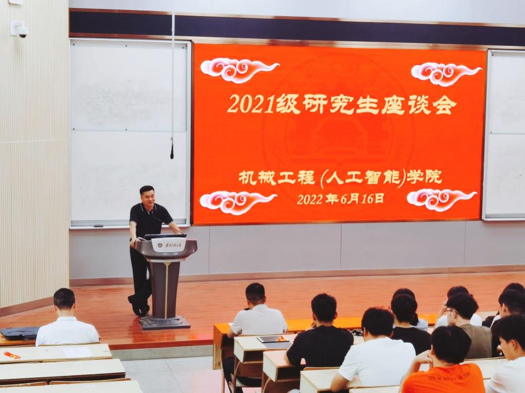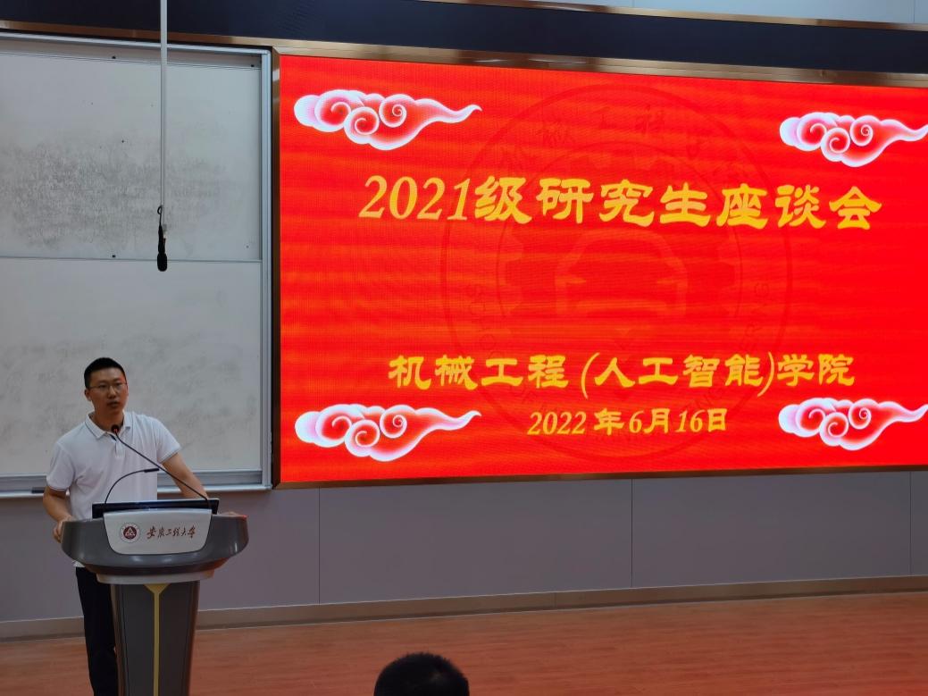 为全面准确掌握研究生培养过程中存在的问题,深层次了解研究生的思想、学习、科研、生活等情况,不断提升研究生培养质量和管理水平,6月16日上午,机械工程学院(人工智能学院)在2J报告厅召开了研究生座谈会。学院分管研究生工作的副院长王建平、研究生秘书吴路路、研究生辅导员鞠锦勇、青年教师王安恒及全体21级硕士研究生参加座谈。会议由鞠锦勇老师主持。