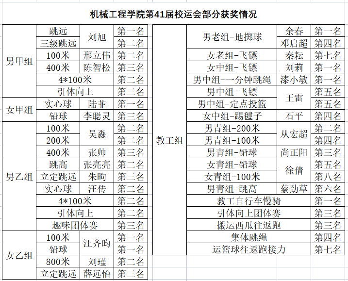 赛场上,运动员们斗志昂扬,永不言弃,超越自我,用汗水为学院争夺一个又一个荣耀。车辆工程222班汪齐昀荣获100m、铅球双料冠军,刘旭荣获跳远第一名、三级跳远第二名,陆菲荣获实心球第一名等;刘莉老师荣获飞镖第一名,余春老师荣获地掷球第一名,漆小敏老师荣获一分钟跳绳第一名,从宏超老师荣获200米第二名,尚正阳老师荣获铅球第三名,自行车慢骑荣获团体第一名,引体向上荣获团体第三名,搬运西瓜往返跑荣获团体第三名等。