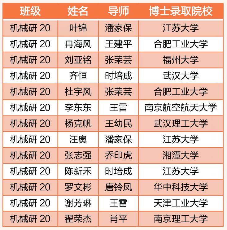 连日来,全国各博士研究生招生单位陆续发布2023年博士入学录取人员名单,截止2023年5月30日,机械工程学院2023届毕业生博士升学人数已达13人,占学院毕业研究生总人数的13.27%。被录取的高校包括:华中科技大学、武汉大学、南京航空航天大学等“双一流”高校和机械工程领域强势学科高校。