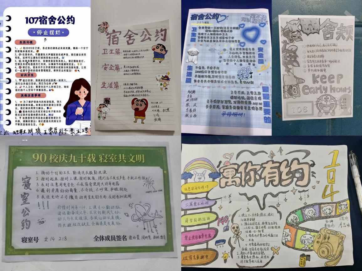 活动以宿舍为单位,组织学生结合学习生活实际,共同制定或修订宿舍文明公约。公约内容在涵盖作息时间、卫生轮值与学习氛围等基础模块的同时,积极融入九十周年校庆元素及宿舍安全、消防安全、防诈骗等专题内容,充分激发了学生的创造力与主体意识。各宿舍通过手绘海报、艺术排版、集体签名设计等创意化形式,将公约转化为兼具规范性、审美性与宿舍特色的“室内文化标识”。所有学生宿舍均已完成全员签字确认,并将公约张贴于宿舍公共区域,成为大家共同遵守的集体承诺。