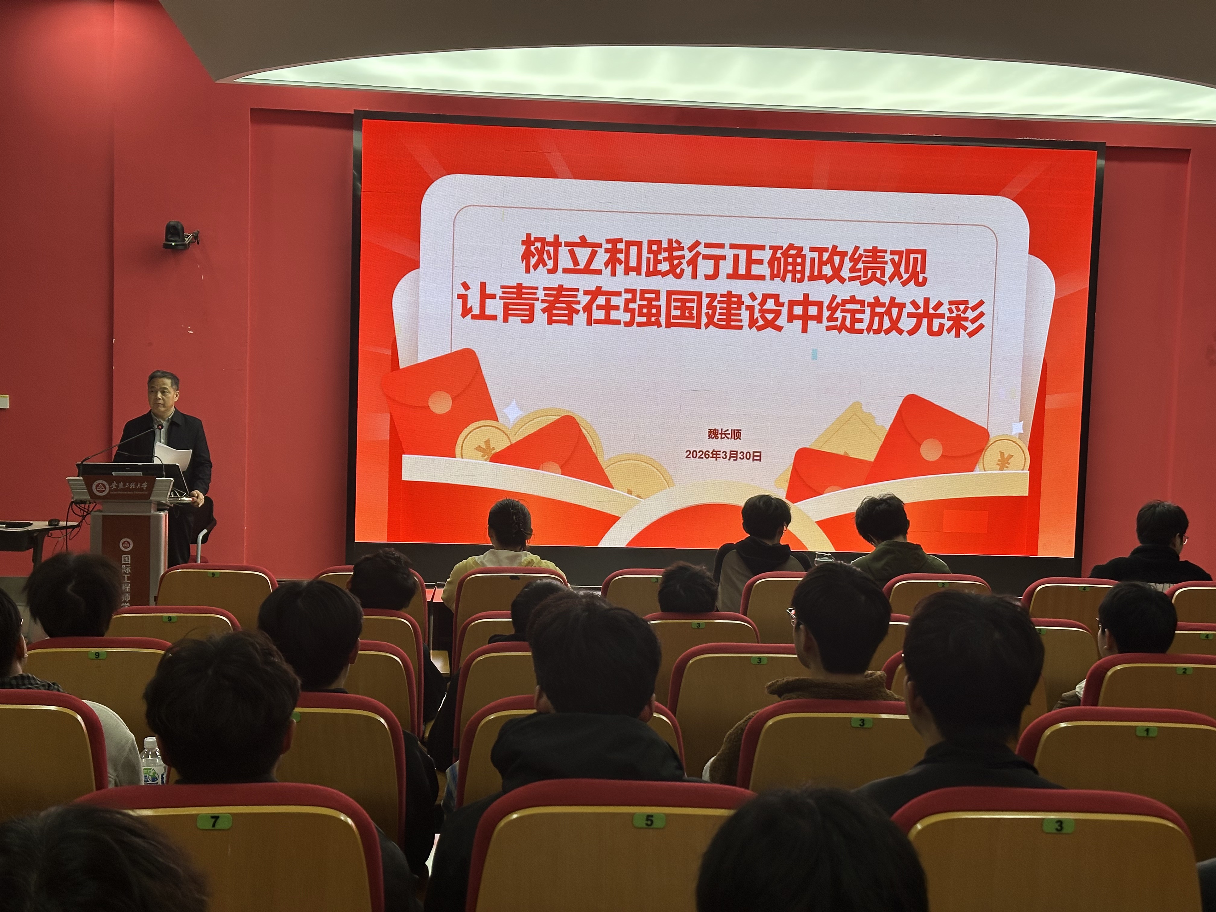 3月30日晚,学院党委书记魏长顺以《树立和践行正确政绩观 让青春在强国建设中绽放光彩》为题作专题报告。魏长顺从深刻认识树立和践行正确政绩观的重大意义、准确把握核心要义、青年党员要带头践行等方面展开讲解。他表示,政绩观本质是世界观、人生观、价值观的集中体现,关系党的形象和执政根基。他结合浙江“千万工程”与秦岭违建别墅事件等正反案例,强调“为民造福是最大政绩”“真干才能真出业绩”。报告还列举了多位学生党员在科研、服务中践行正确政绩观的生动事例,勉励全体预备党员扣好“人生第一粒扣子”,把个人理想融入党和人民事业,在强国建设中绽放青春光彩。