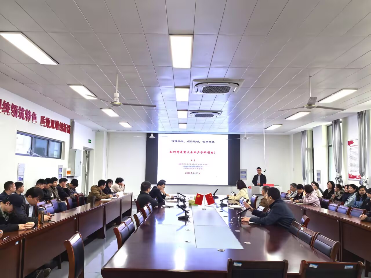 为深入推进校企协同创新,提升学院科研团队产学研合作能力与成果转化水平,4月15日,校科技处副处长王勇应邀到澳门六合彩官方网址 作“价值共生 项目驱动 长期共赢——如何开展重点企业产学研项目”专题报告。报告会由院长潘家保主持。